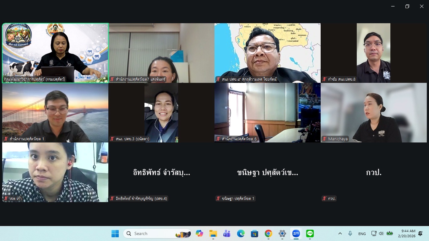 วันที่ 20 กุมภาพันธ์ 2569 นายกำชัย กิจศิลป นายสัตวแพทย์ชำนาญการพิเศษ ส่วนสุขภาพสัตว์ สำนักงานปศุสัตว์เขต 8 เข้าร่วมประชุมชี้แจงการดำเนินงานของคณะทำงานขับเคลื่อนงานวิจัย นวัตกรรม หรือวิชาการของกรมปศุสัตว์ ในระดับเชิงพื้นที่ ครั้งที่ 1/2569 เพื่อติดตามผลการดำเนินงานในปีงบประมาณ พ.ศ. 2568 และชี้แจงแนวทางในการขับเคลื่อนงานวิจัย นวัตกรรมของกรมปศุสัตว์ ในปีงบประมาณ พ.ศ. 2569 การประชุมผ่านสื่ออิเล็กทรอนิกส์ด้วย ด้วย Zoom Meeting