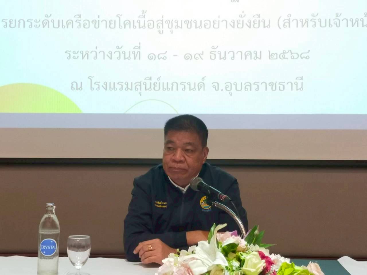 วันที่ 18 -19 ธันวาคม 2568 เจ้าหน้าที่ส่วนส่งเสริมและพัฒนาการปศุสัตว์ สำนักงานปศุสัตว์เขต 8 เข้าร่วมโครงการฝึกอบรมเชิงปฏิบัติการการยกระดับเครือข่ายโคเนื้อสู่ชุมชนอย่างยั่งยืน ณ โรงแรมสุนีย์แกรนด์ จังหวัดอุบลราชธานี โดยมีนายพงษ์พันธ์ ธรรมมา รองอธิบดีกรมปศุสัตว์ มาเป็นประธานในพิธีเปิด ผู้ร่วมโครงการฝึกอบรมประกอบด้วย เจ้าหน้าที่สำนักงานปศุสัตว์เขต 1-9 และสำนักงานปศุสัตว์จังหวัด 20 จังหวัด รวม 70 ราย มีวัตถุประสงค์เพื่อเชื่อมโยงและแลกเปลี่ยนประสบการณ์ในการแก้ไขปัญหาราคาโคตกต่ำ และศึกษาดูงานการดำเนินงาน เขียงชุมชน กลุ่มวิสาหกิจชุมชนโคเนื้อนิลอุบล ตำบลหนองเมือง อำเภอม่วงสามสิบ และโรงเชือดสมรฟาร์ม ตำบลแพงใหญ่ อำเภอเหล่าเสือโก้ก จังหวัดอุบลราชธานี