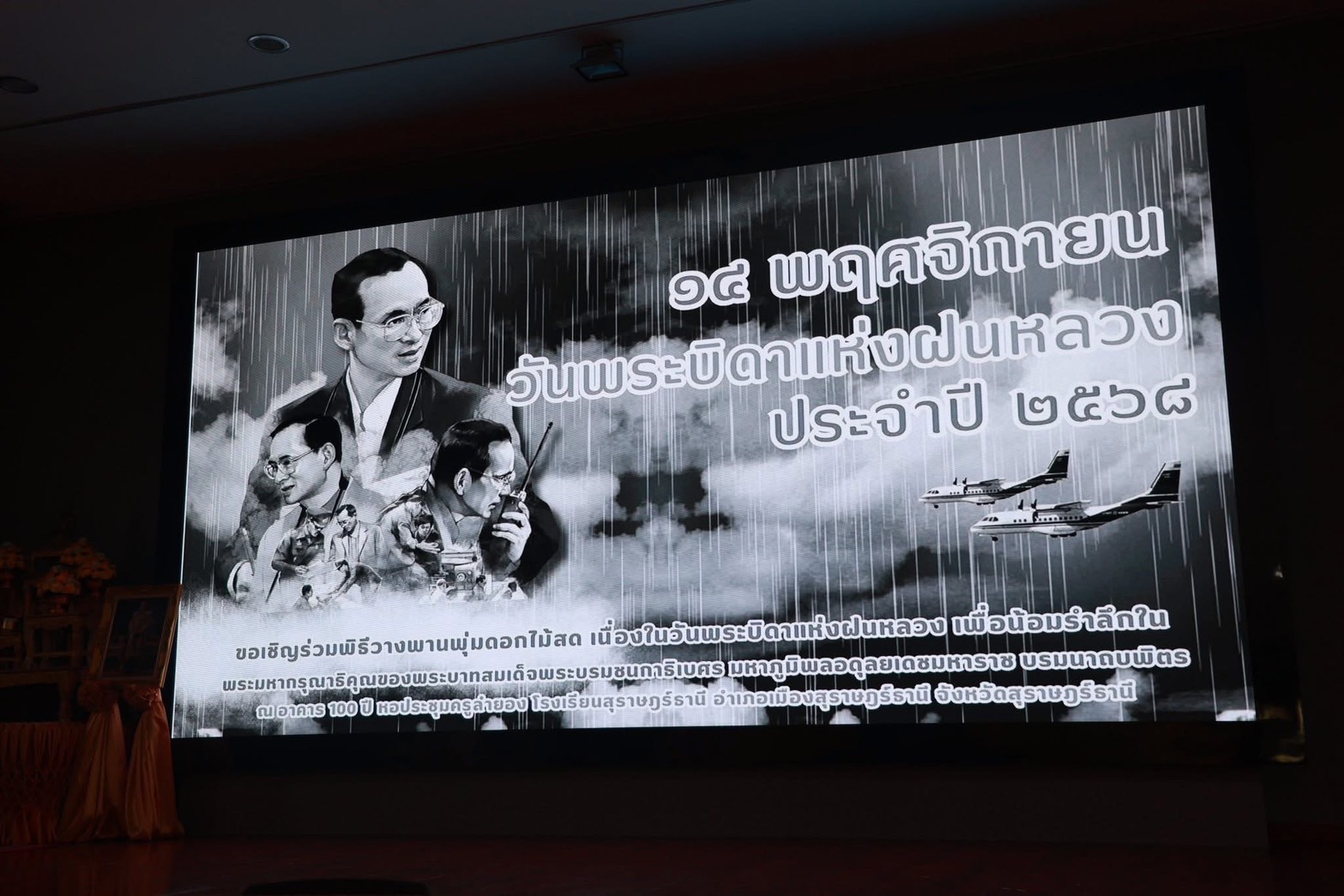 วันที่ 14 พฤศจิกายน 2568 ส่วนสุขภาพสัตว์ สำนักงานปศุสัตว์เขต 8 ร่วมพิธีวางพานพุ่มดอกไม้สดเนื่องในวันพระบิดาแห่งฝนหลวง ประจำปี 2568 ณ อาคาร 100 ปี หอประชุมครูลำยอง โรงเรียนสุราษฎร์ธานี อำเภอเมือง จังหวัดสุราษฎร์ธานี