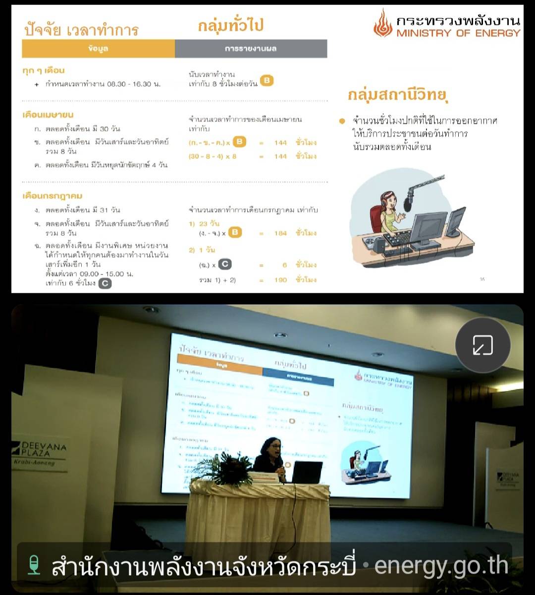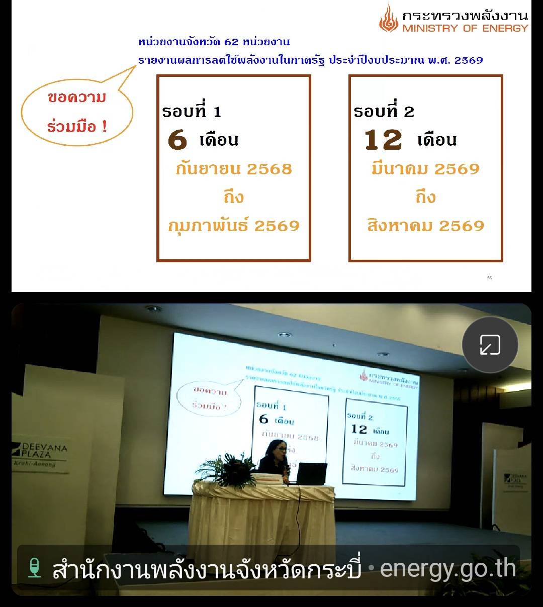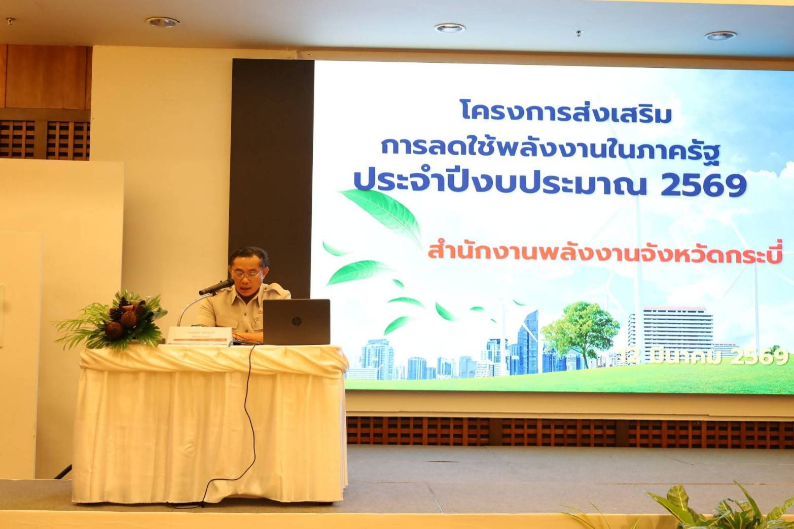 วันที่ 12 มีนาคม 2569 นายวิสูตร นวลขาว นายสัตวแพทย์ชำนาญการพิเศษ รักษาราชการแทน ปศุสัตว์จังหวัดกระบี่ มอบหมายให้ นางจุฑามาศ สุระกุล เจ้าพนักงานสัตวบาลปฏิบัติงาน และ นายโกวิทย์ หมื่นไชยชุม เจ้าพนักงานสัตวบาล เจ้าหน้าที่กลุ่มยุทธศาสตร์และสารสนเทศการปศุสัตว์ เข้าร่วมสัมมนา "โครงการส่งเสริมการลดใช้พลังงานในภาครัฐ ปีงบประมาณ พ.ศ. 2569" ณ ห้องประชุม Hornbill Grand Ballroom โรงแรมดีวาน่าพลาซ่า กระบี่ อ่าวนาง ตำบลอ่าวนาง อำเภอเมืองกระบี่ จังหวัดกระบี่ โดยมี นายพงษ์ธร จันทร์สวัสดิ์ ปลัดจังหวัดกระบี่ เป็นประธานในพิธีเปิด และมี บุคลากรจากหน่วยงาน ส่วนราชการ และที่ทำการปกครองอำเภอ 70 คน พร้อมด้วยบุคลากรจากองค์กรปกครองส่วนท้องถิ่น 62 หน่วยงาน เข้าร่วม