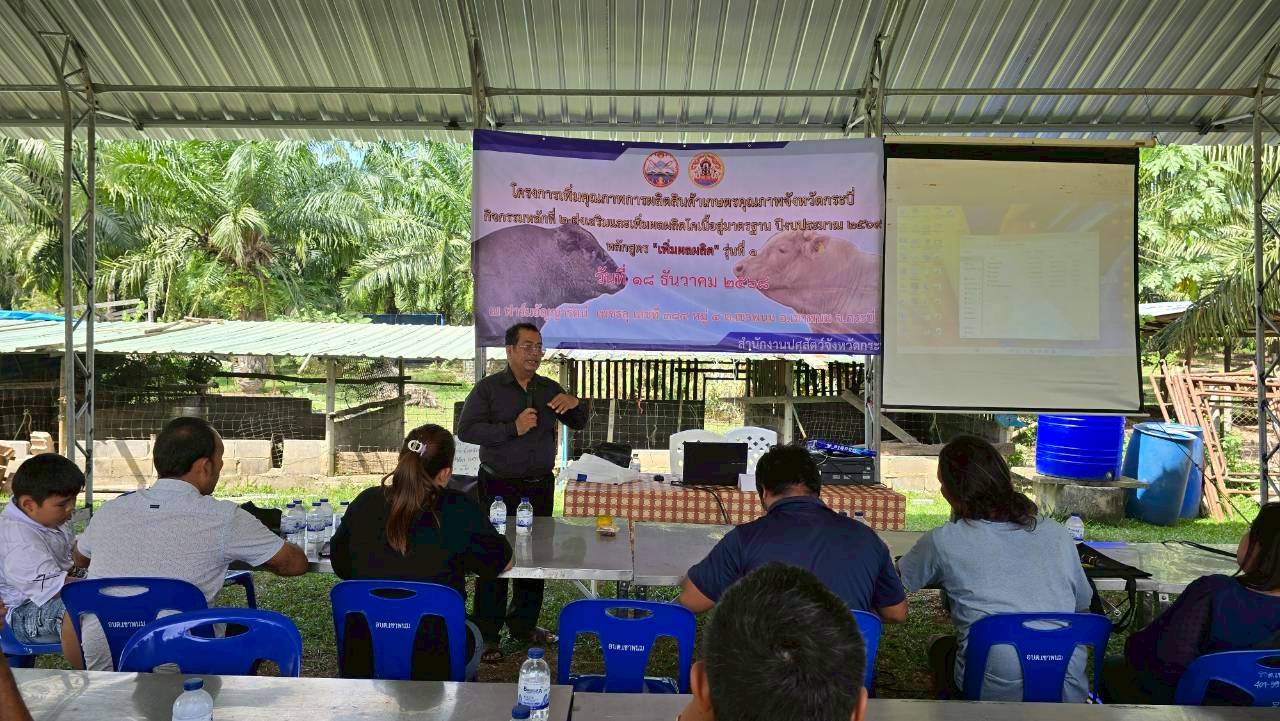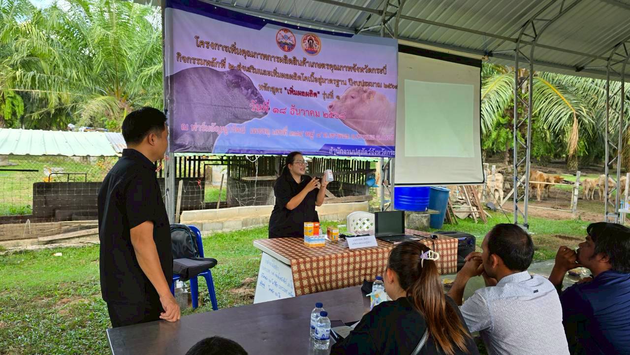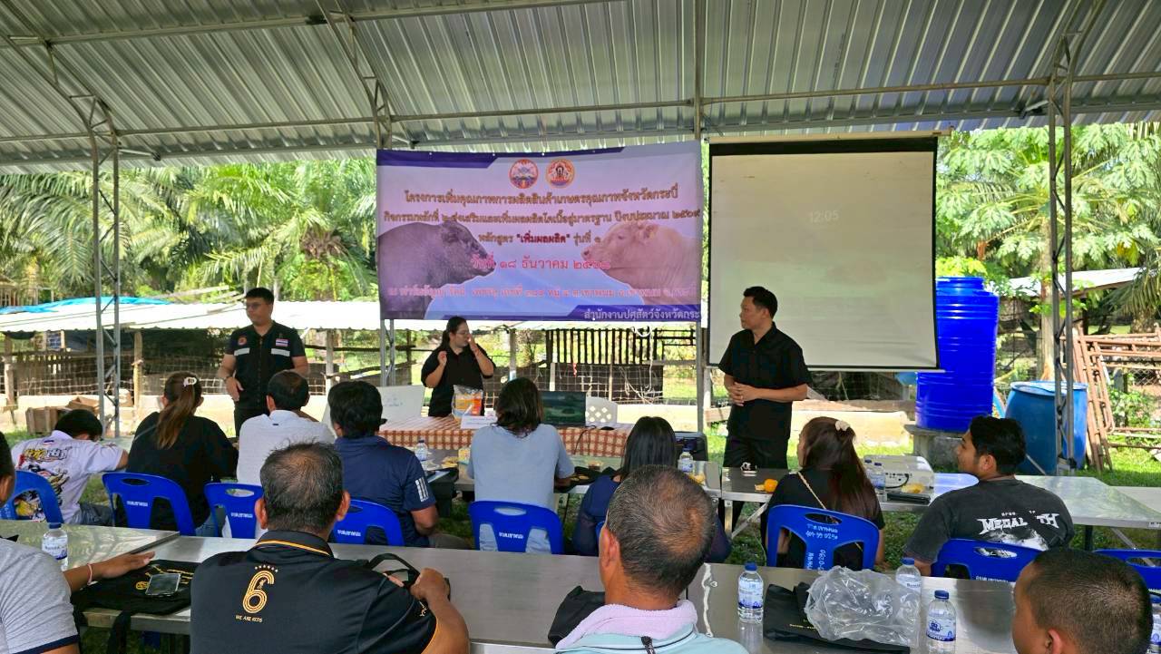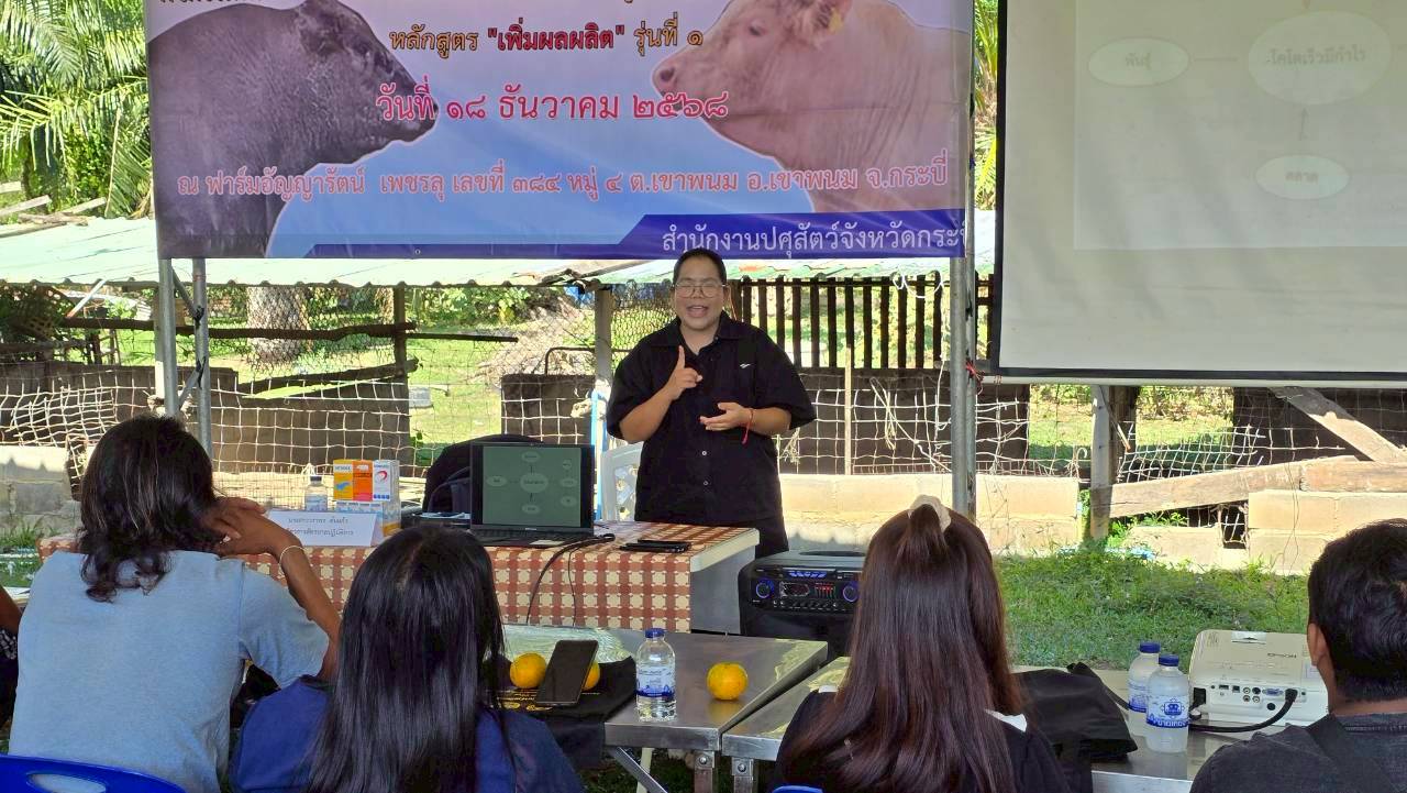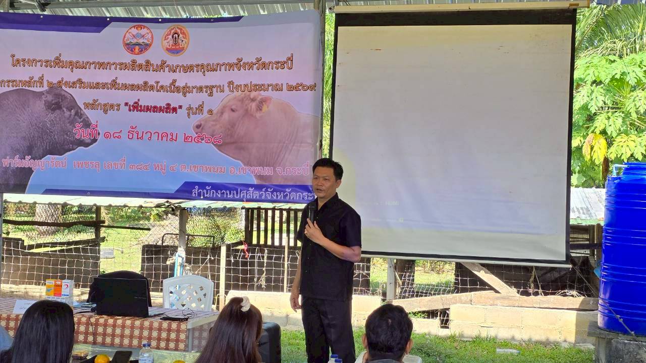 วันที่ 18 ธันวาคม 2568 เวลา 14.00 น. นายวิสูตร นวลขาว นายสัตวแพทย์ชำนาญการพิเศษ รักษาราชการแทน ปศุสัตว์จังหวัดกระบี่ มอบหมายให้นายวัชรินทร์ ปันนิตามัย หัวหน้ากลุ่มยุทธศาสตร์และสารสนเทศการปศุสัตว์ และเจ้าหน้าที่กลุ่มยุทธศาสตร์และสารสนเทศการปศุสัตว์ ร่วมกับ นางสาวขนิษฐา ทองกอบ เจ้าพนักงานสัตวบาลชำนาญงาน รักษาราชการแทนปศุสัตว์อำเภอเมืองเขาพนม เจ้าหน้าที่สำนักงานปศุสัตว์อำเภอลำทับ เจ้าหน้าที่สำนักงานปศุสัตว์อำเภอเกาะลันตา เจ้าหน้าที่สำนักงานปศุสัตว์อำเภอคลองท่อม และ เจ้าหน้าที่สำนักงานปศุสัตว์อำเภอเหนือคลอง ฝึกอบรมเกษตรกร หลักสูตร "เพิ่มผลผลิต" รุ่นที่ 1 โครงการเพิ่มคุณภาพการผลิตสินค้าเกษตรคุณภาพจังหวัดกระบี่ ปีงบประมาณ พ.ศ. 2569 จำนวน 50 ราย ณ ฟาร์มอัญญารัตน์ เพชรลุ 384 หมู่ที่ 4 ตำบลเขาพนม อำเภอเขาพนม จังหวัดกระบี่