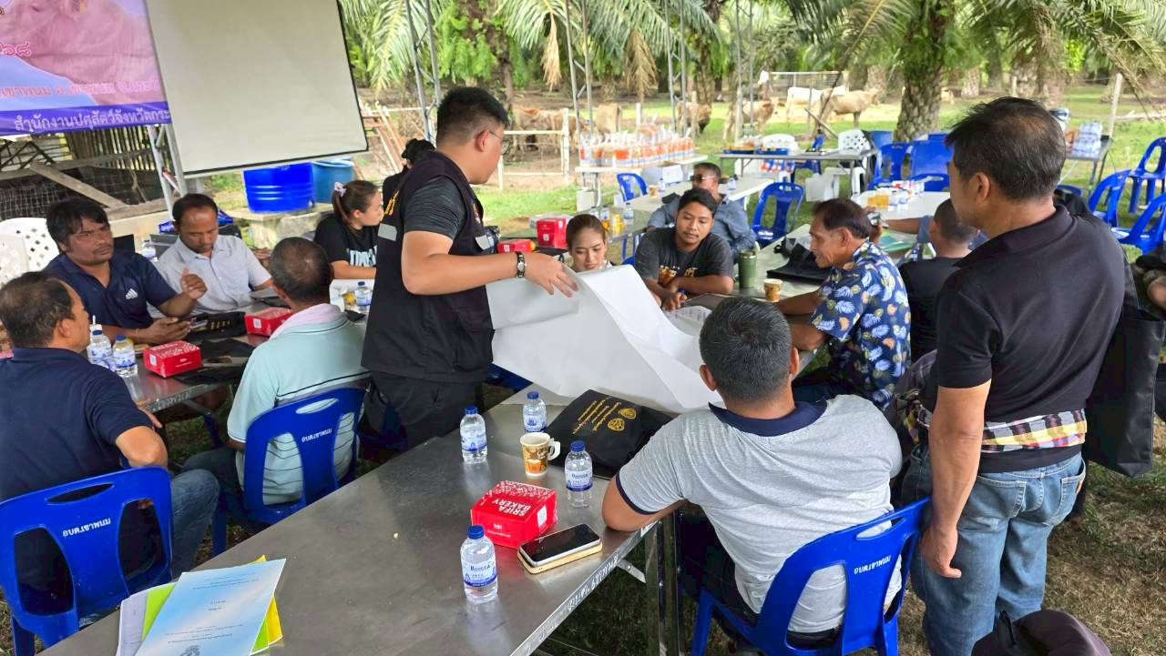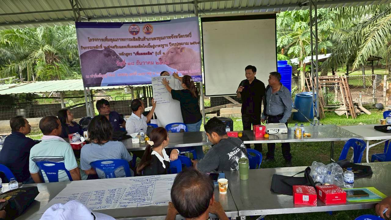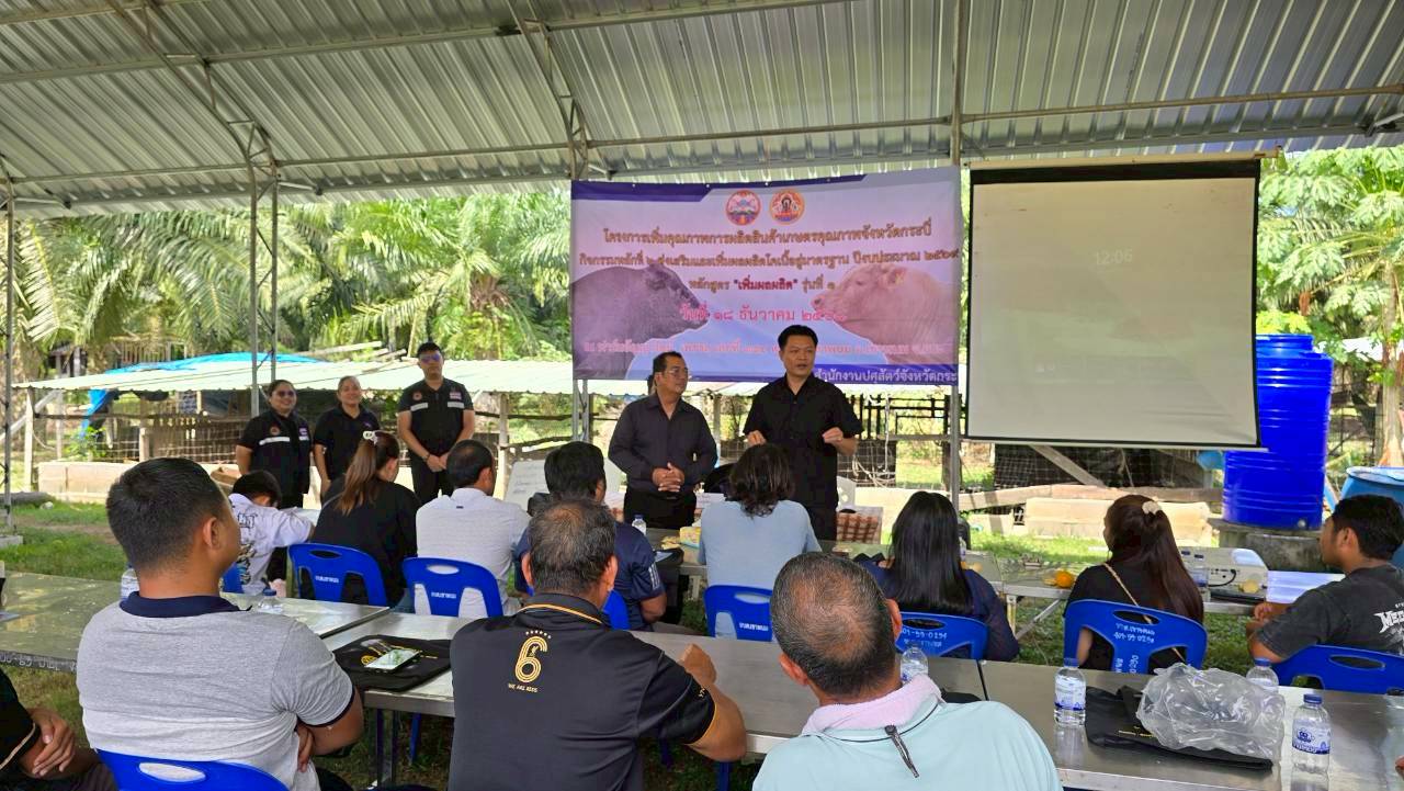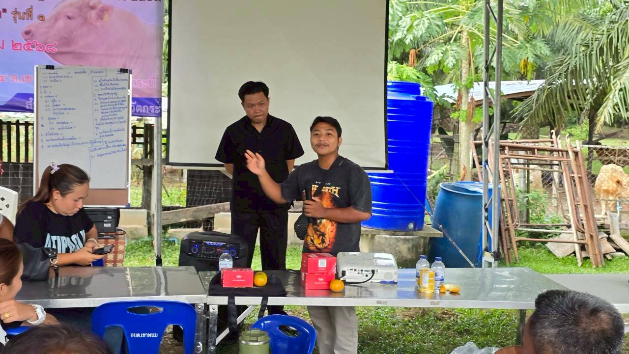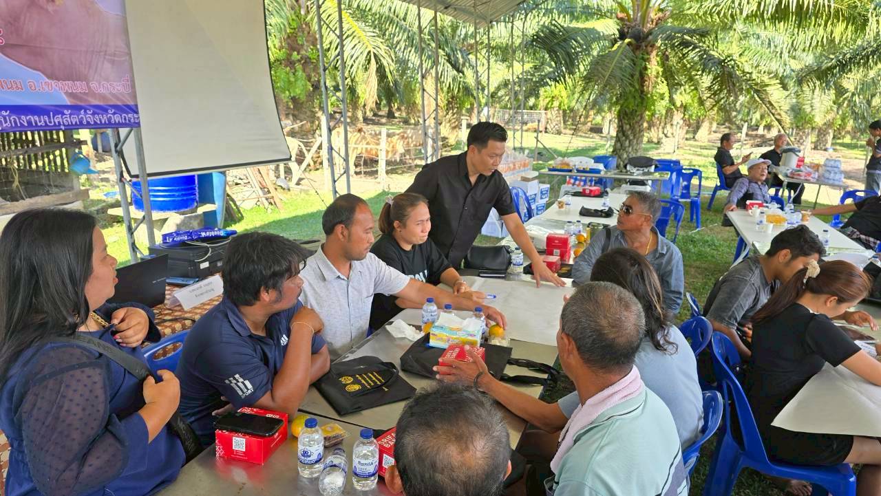 วันที่ 18 ธันวาคม 2568 เวลา 14.00 น. นายวิสูตร นวลขาว นายสัตวแพทย์ชำนาญการพิเศษ รักษาราชการแทน ปศุสัตว์จังหวัดกระบี่ มอบหมายให้นายวัชรินทร์ ปันนิตามัย หัวหน้ากลุ่มยุทธศาสตร์และสารสนเทศการปศุสัตว์ และเจ้าหน้าที่กลุ่มยุทธศาสตร์และสารสนเทศการปศุสัตว์ ร่วมกับ นางสาวขนิษฐา ทองกอบ เจ้าพนักงานสัตวบาลชำนาญงาน รักษาราชการแทนปศุสัตว์อำเภอเมืองเขาพนม เจ้าหน้าที่สำนักงานปศุสัตว์อำเภอลำทับ เจ้าหน้าที่สำนักงานปศุสัตว์อำเภอเกาะลันตา เจ้าหน้าที่สำนักงานปศุสัตว์อำเภอคลองท่อม และ เจ้าหน้าที่สำนักงานปศุสัตว์อำเภอเหนือคลอง ฝึกอบรมเกษตรกร หลักสูตร "เพิ่มผลผลิต" รุ่นที่ 1 โครงการเพิ่มคุณภาพการผลิตสินค้าเกษตรคุณภาพจังหวัดกระบี่ ปีงบประมาณ พ.ศ. 2569 จำนวน 50 ราย ณ ฟาร์มอัญญารัตน์ เพชรลุ 384 หมู่ที่ 4 ตำบลเขาพนม อำเภอเขาพนม จังหวัดกระบี่