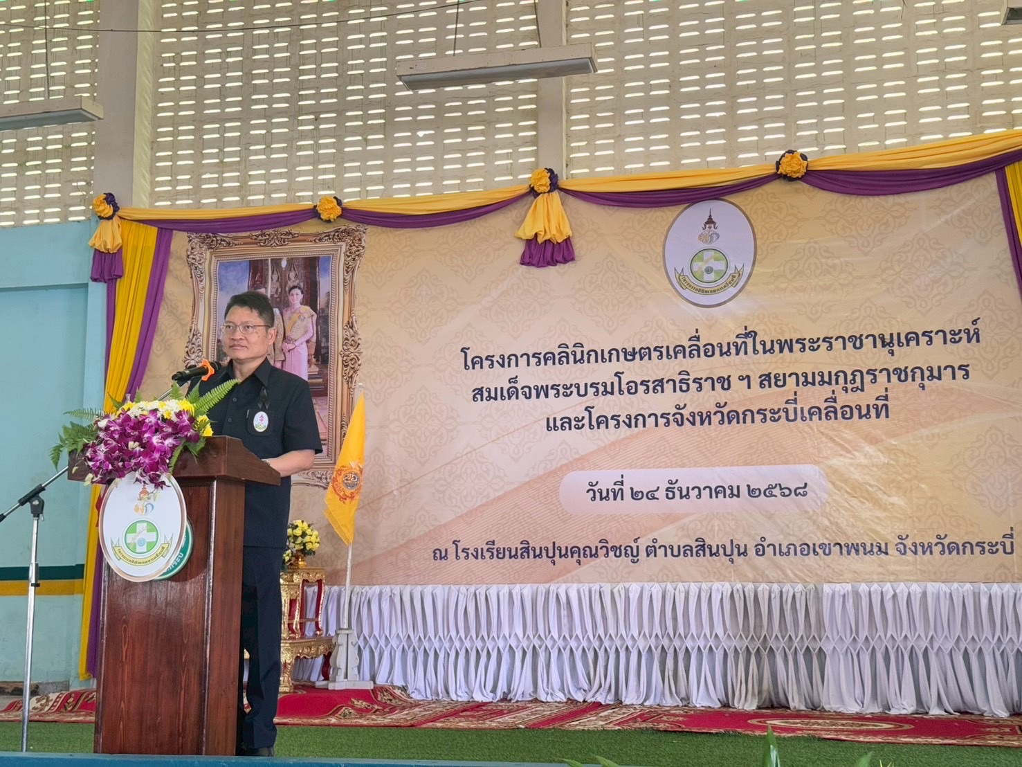 วันที่ 24 ธันวาคม 2568 นายวิสูตร นวลขาว นายสัตวแพทย์ชำนาญการพิเศษ รักษาราชการแทน ปศุสัตว์จังหวัดกระบี่ พร้อมด้วย นางสาวขนิษฐา ทองกอบ เจ้าพนักงานสัตวบาลชำนาญงาน รักษาราชการแทนปศุสัตว์อำเภอเขาพนม เจ้าหน้าที่สำนักงานปศุสัตว์จังหวัดกระบี่ เจ้าหน้าที่สำนักงานปศุสัตว์อำเภอเขาพนม เจ้าหน้าที่สำนักงานปศุสัตว์อำเภอเหนือคลอง เจ้าหน้าที่สำนักงานปศุสัตว์อำเภอปลายพระยา เจ้าหน้าที่สำนักงานปศุสัตว์อำเภอเมืองกระบี่ และนักศึกษาฝึกงาน เข้าร่วมโครงการคลินิกเกษตรเคลื่อนที่ในพระราชานุเคราะห์สมเด็จพระบรมโอรสาธิราชสยามมกุฎราชกุมาร และโครงการจังหวัดกระบี่เคลื่อนที่ ประจำปีงบประมาณ พ.ศ. 2569 ครั้งที่ 1 ณ โรงเรียนสินปุนคุณวิชญ์ ตำบลสินปุน อำเภอเขาพนม จังหวัดกระบี่ โดยมี นายอังกูร ศีลาเทวากูล ผู้ว่าราชการจังหวัดกระบี่ เป็นประธานเปิดโครงการฯ พร้อมด้วย นางศรินทิพย์ ศีลาเทวากูล นายกเหล่ากาชาดจังหวัดกระบี่ หัวหน้าส่วนราชการ หัวหน้าหน่วยงานรัฐวิสาหกิจระดับจังหวัด ระดับอำเภอ องค์กรปกครองส่วนท้องถิ่น กำนัน ผู้ใหญ่บ้าน และประชาชน เข้าร่วมโครงการโดยพร้อมเพรียงกัน
