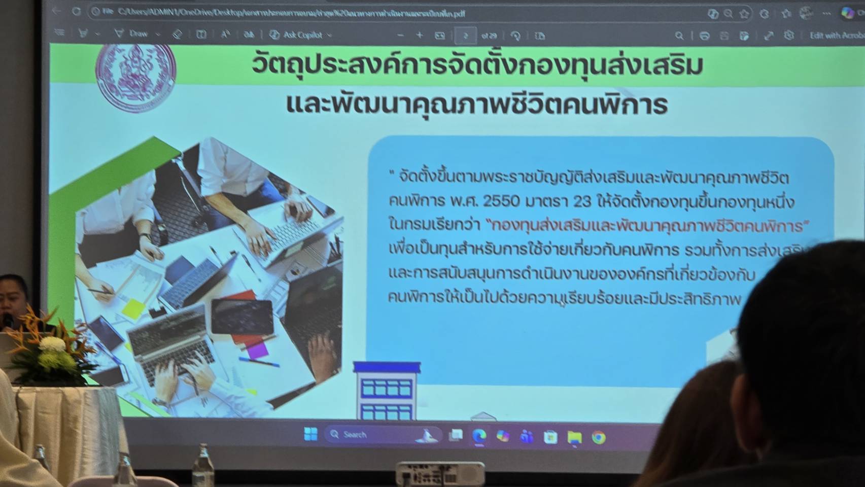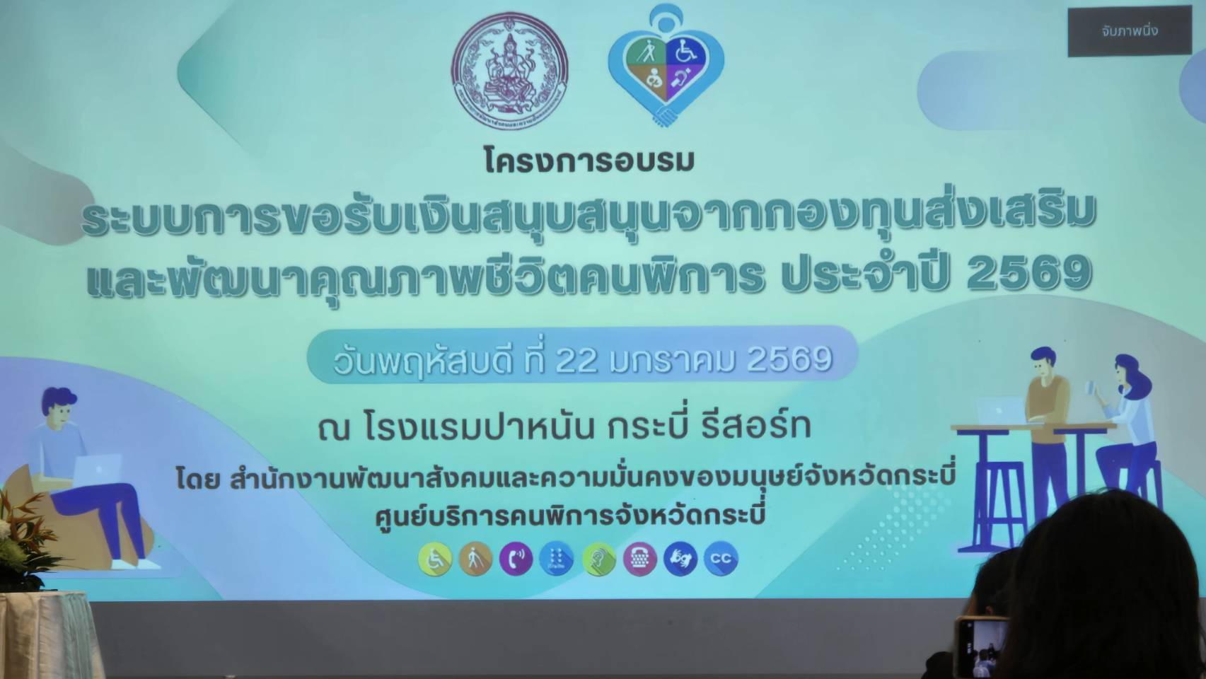 วันที่ 22 มกราคม 2569 นายวิสูตร นวลขาว นายสัตวแพทย์ชำนาญการพิเศษ รักษาราชการแทน ปศุสัตว์จังหวัดกระบี่ มอบหมายให้ นายกมลภพ แย้มโอษฐ เจ้าหน้าที่ระบบงานคอมพิวเตอร์ เข้าร่วมโครงการอบรมระบบการขอรับสนับสนุนเงินจากกองทุนส่งเสริมและพัฒนาคุณภาพชีวิตคนพิการ ประจำปี พ.ศ. 2569 เพื่อเสริมสร้างความรู้ ความเข้าใจ และมีทักษะในการใช้ระบบงานกองทุนส่งเสริมและพัฒนาคุณภาพชีวิตคนพิการอย่างถูกต้อง และเป็นไปในแนวทางเดียวกัน โดยมี คณะอนุกรรมการส่งเสริมและพัฒนาคุณภาพชีวิตคนพิการประจำจังหวัดกระบี่ คณะทำงานเพื่อการพิจารณาวาระการประชุมคณะอนุกรรมการส่งเสริมและพัฒนาคุณภาพชีวิตคนพิการประจำจังหวัดกระบี่ องค์การปกครองส่วนท้องถิ่น (ที่จัดตั้งเป็นศูนย์บริการคนพิการทั่วไป) องค์กรคนพิการ ล่ามภาษามือ วิทยากรและเจ้าหน้าที่ของศูนย์บริการคนพิการจังหวัดกระบี่ จำนวน 98 คน เข้าร่วมอบรมโดยพร้อมเพรียงกัน ณ โรงแรมปาหนัน กระบี่ รีสอร์ท อำภอเมืองกระบี่ จังหวัดกระบี่