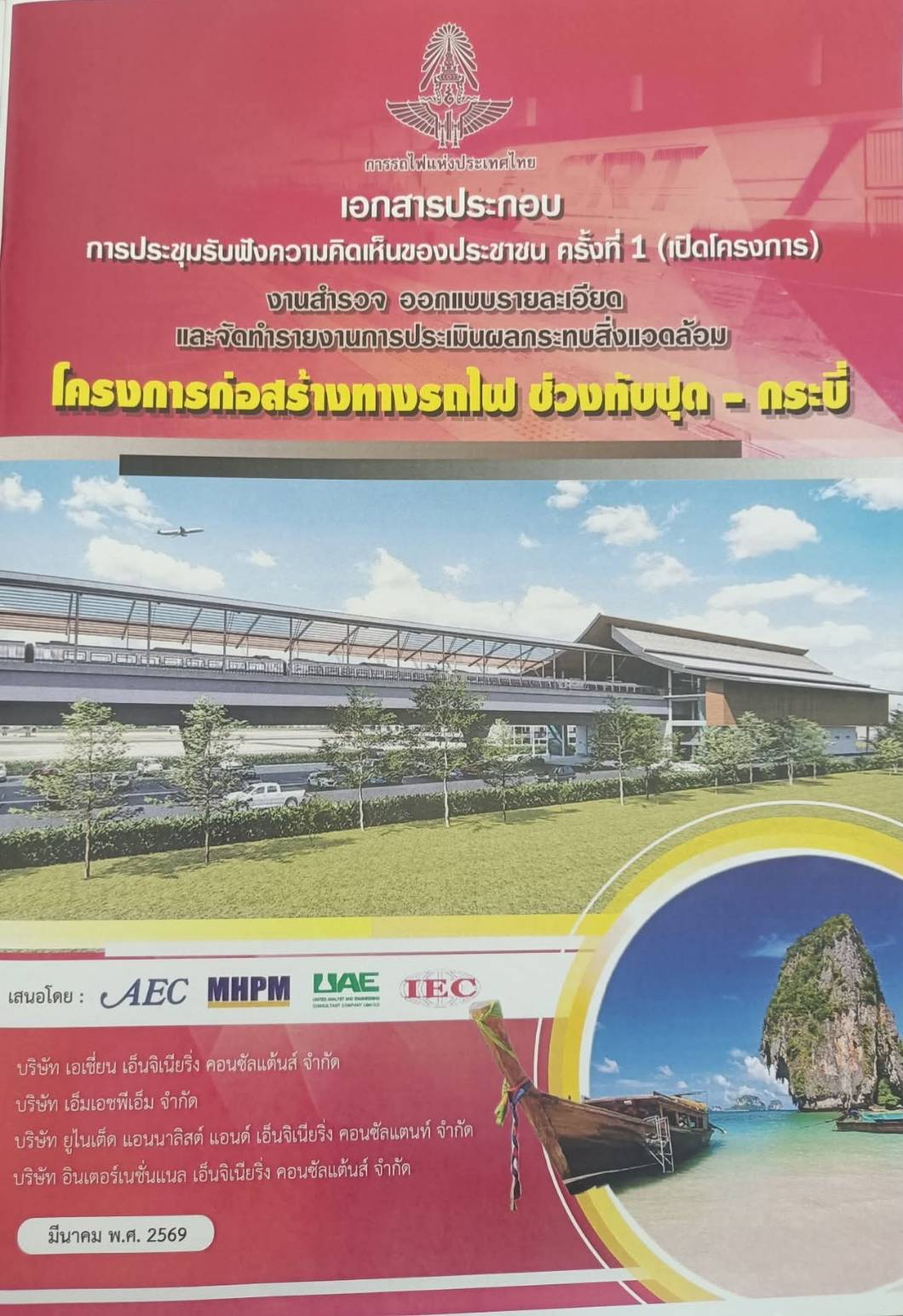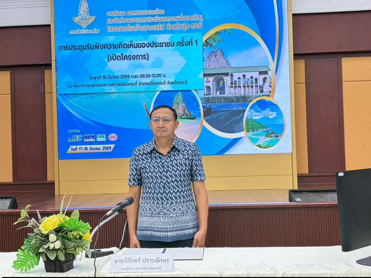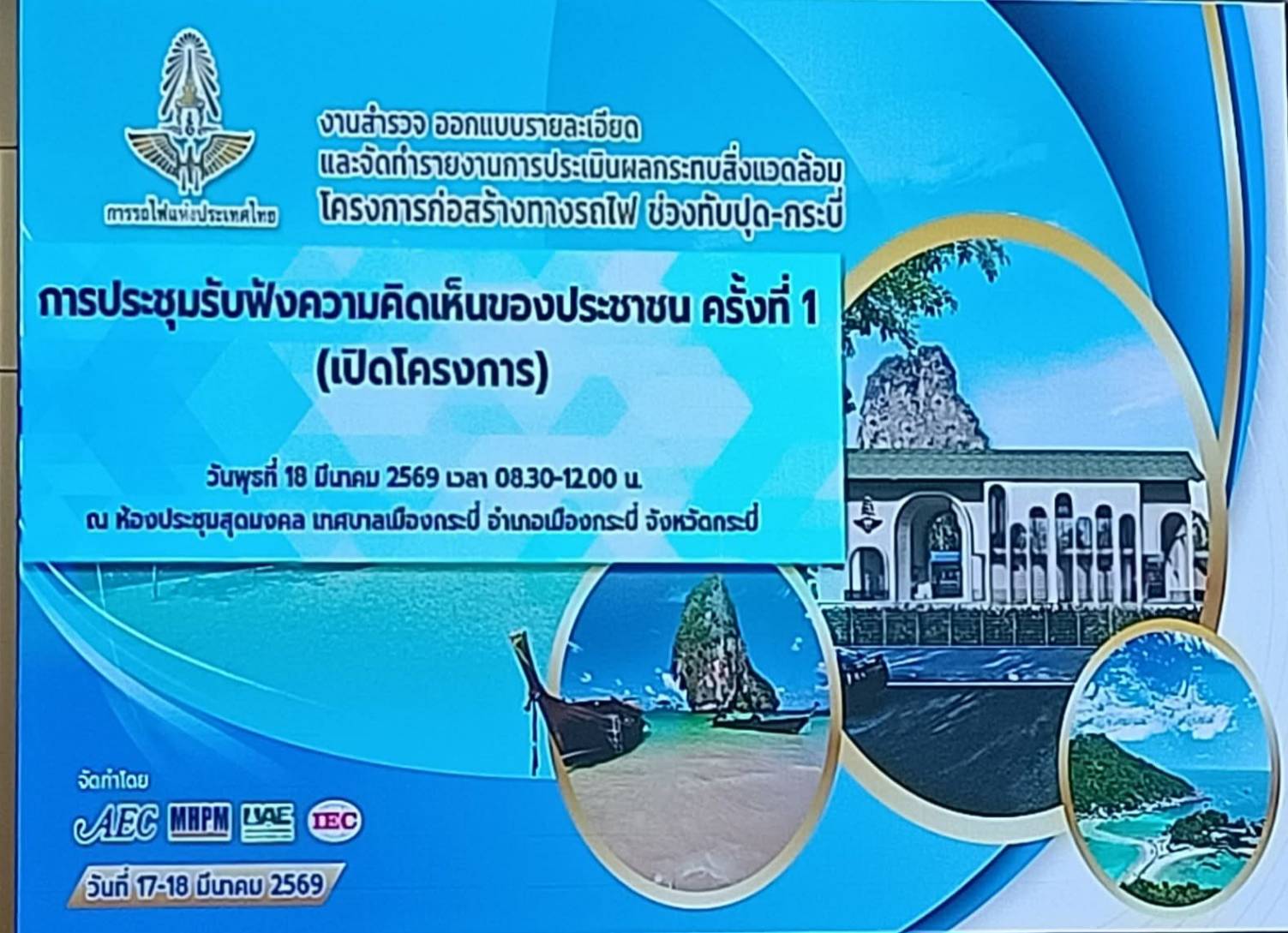 วันที่ 18 มีนาคม 2569 นายวิสูตร นวลขาว นายสัตวแพทย์ชำนาญการพิเศษ รักษาราชการแทน ปศุสัตว์จังหวัดกระบี่ มอบหมายให้ นางจุฑามาศ สุระกุล เจ้าพนักงานสัตวบาลปฏิบัติงาน และ นายศิวดล บุญเทียน เจ้าพนักงานสัตวบาลปฏิบัติงาน เจ้าหน้าที่กลุ่มยุทธศาสตร์และสารสนเทศการปศุสัตว์ เข้าร่วมประชุมรับฟังความคิดเห็นประชาชน ครั้งที่ 1 (เปิดโครงการ) งานสำรวจ ออกแบบรายละเอียด และจัดทำรายงานการประเมินผลกระทบสิ่งแวดล้อม โครงการก่อสร้างทางรถไฟ ช่วงทับปุด–กระบี่ เพื่อรับทราบข้อมูลโครงการและร่วมแสดงความคิดเห็นในมิติต่าง ๆ ณ ห้องประชุมสุดมงคล เทศบาลเมืองกระบี่ โดยมี นายนิรันดร์ ปราบอักษร รองผู้ว่าราชการจังหวัดกระบี่ เป็นประธานเปิดการประชุม