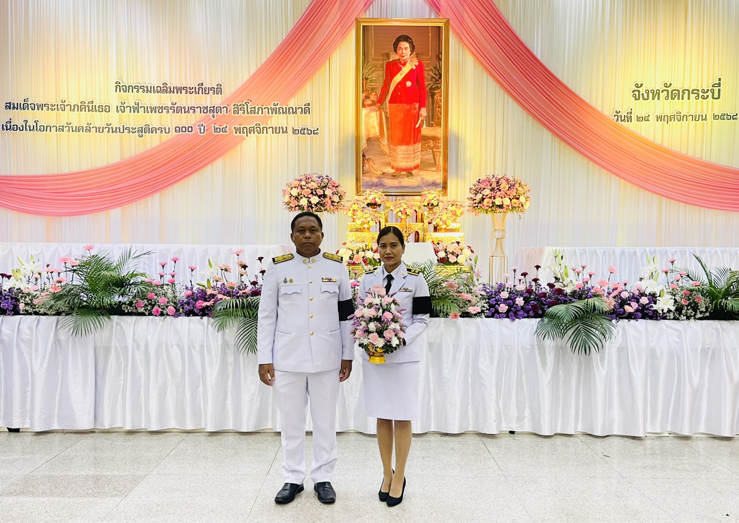 วันที่ 24 พฤศจิกายน 68 นายสัตวแพทย์วิสูตร นวลขาว นายสัตวแพย์ชำนาญการพิเศษรักษาราชการแทนปศุสัตว์จังหวัดกระบี่พร้อมด้วยเจ้าหน้าที่กลุ่มพัฒนาคุณภาพสินค้าปศุสัตว์ ร่วมพิธีวางพานพุ่มดอกไม้ถวายราชสักการะ สมเด็จพระเจ้าบรมวงศ์เธอ เจ้าฟ้าเพชรรัตนราชสุดา สิริโสภาพัณณวดี กรมพระนครปฐมบรมขัตติยานี มหาธีรราชธิดา เนื่องในโอกาสคล้ายวันประสูติครบ 100 ปี 24 พฤศจิกายน 2568 โดยมี นายอังกูร ศีลาเทวากูล ผู้ว่าราชการจังหวัดกระบี่ เป็นประธานประกอบพิธี โดยมีหัวหน้าส่วนราชการ ข้าราชการพลเรือน ตุลาการ อัยการ ทหาร ตำรวจ พนักงานรัฐวิสาหกิจ ผู้บริหารสถานศึกษา ผู้บริหารองค์กรปกครองส่วนท้องถิ่น เหล่ากาชาดจังหวัด ภาคเอกชน สมาคม มูลนิธิ และประชาชนชาวกระบี่ทุกหมู่เหล่า เข้าร่วมพิธีอย่างพร้อมเพรียง ณ ห้องประชุมช้างเผือก องค์การบริหารส่วนจังหวัดกระบี่ อำเภอเมืองกระบี่ จังหวัดกระบี่