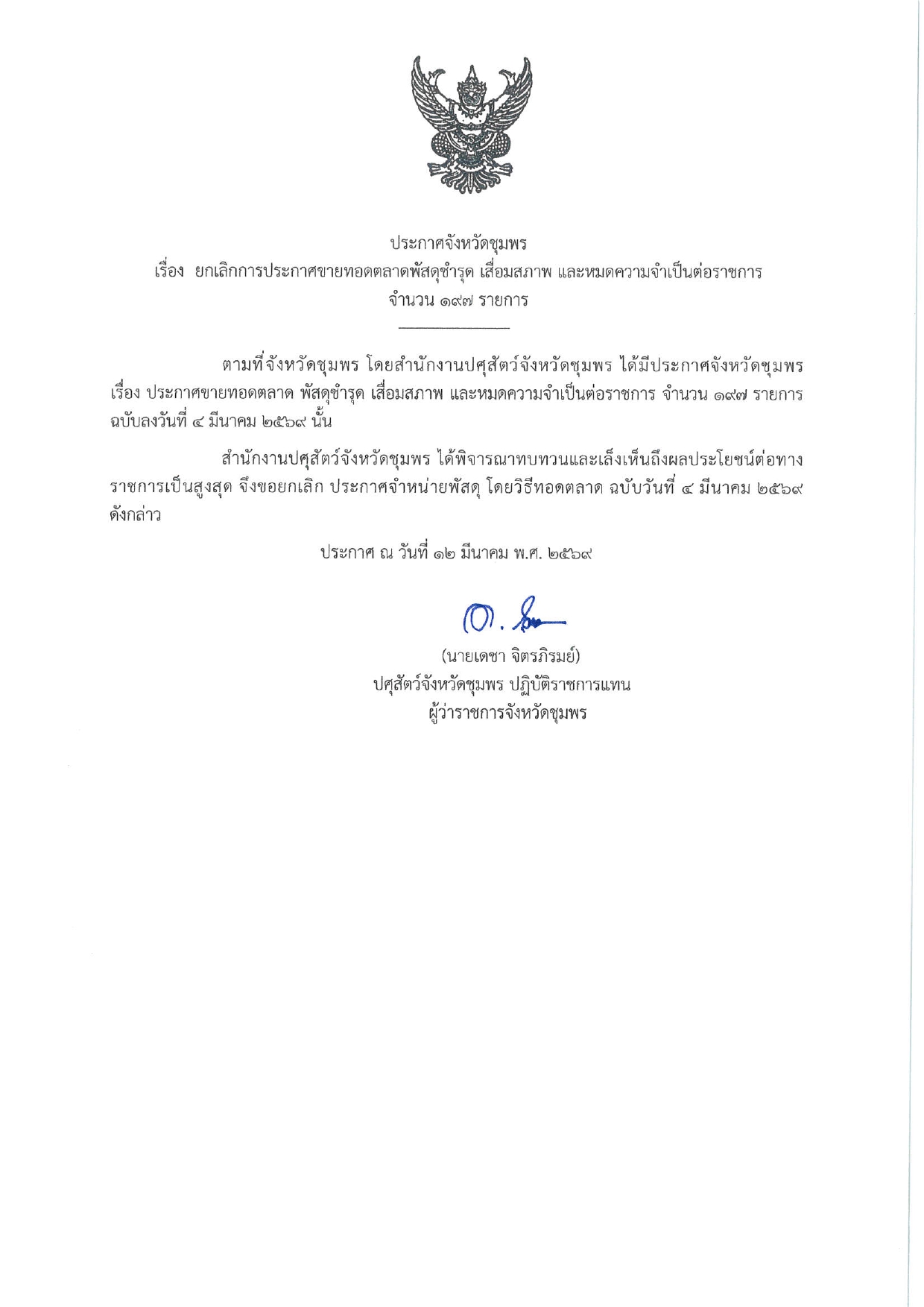 ประกาศจังหวัดชุมพร เรื่อง ยกเลิกการประกาศขายทอดตลาดพัสดุชำรุด เสื่อมสภาพ และหมดความจำเป็นต่อราชการ จำนวน 197 รายการ <<...รายละเอียด..>>>