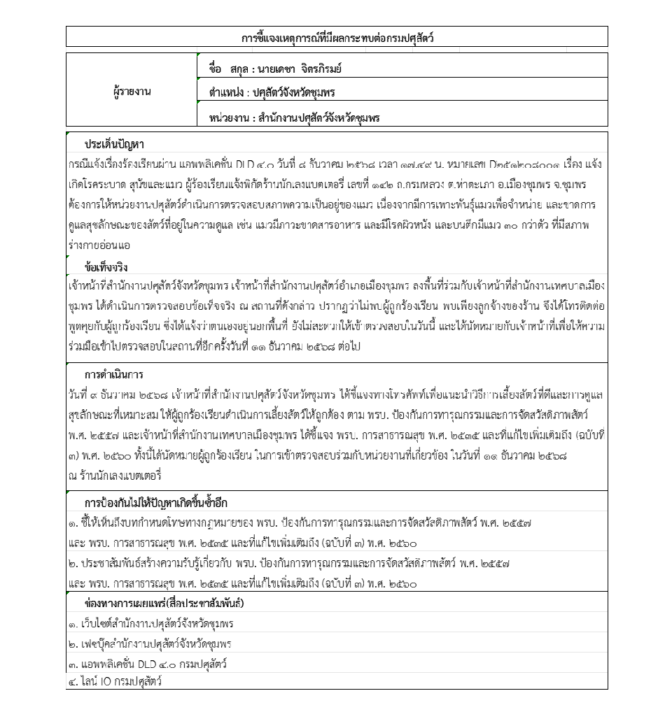 การชี้แจงเหตุการณ์ที่มีผลกระทบต่อกรมปศุสัตว์
