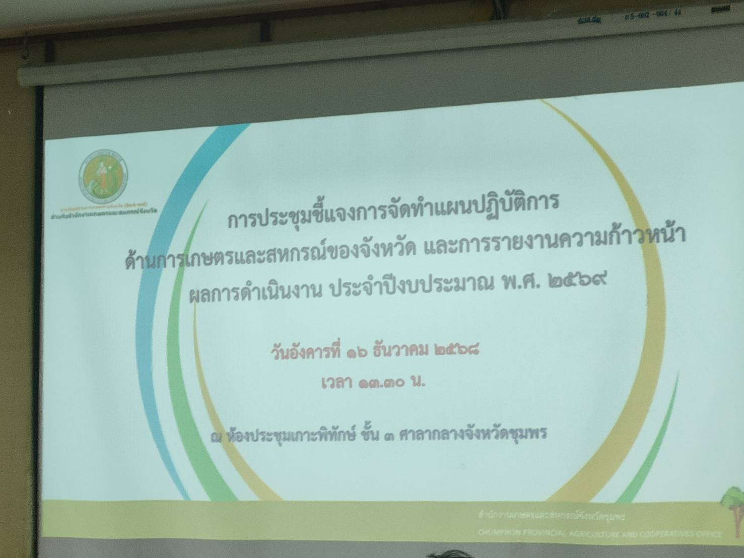 วันที่ 16 ธันวาคม 2568 เวลา 13.30 น. นายเดชา จิตรภิรมย์ ปศุสัตว์จังหวัดชุมพร มอบหมายให้นายปราโมทย์ ศิลาจันทร์ ตำแหน่งเจ้าพนักงานสัตวบาลปฏิบัติงาน เข้าร่วมประชุมชี้แจงการจัดทำแผนปฏิบัติการด้านการเกษตรและสหกรณ์ของจังหวัด และการรายงานความก้าวหน้าผลการดำเนินงาน ประจำปีงบประมาณ พ.ศ.2569 ณ ห้องประชุมเกาะพิทักษ์ ศาลากลางจังหวัดชุมพร