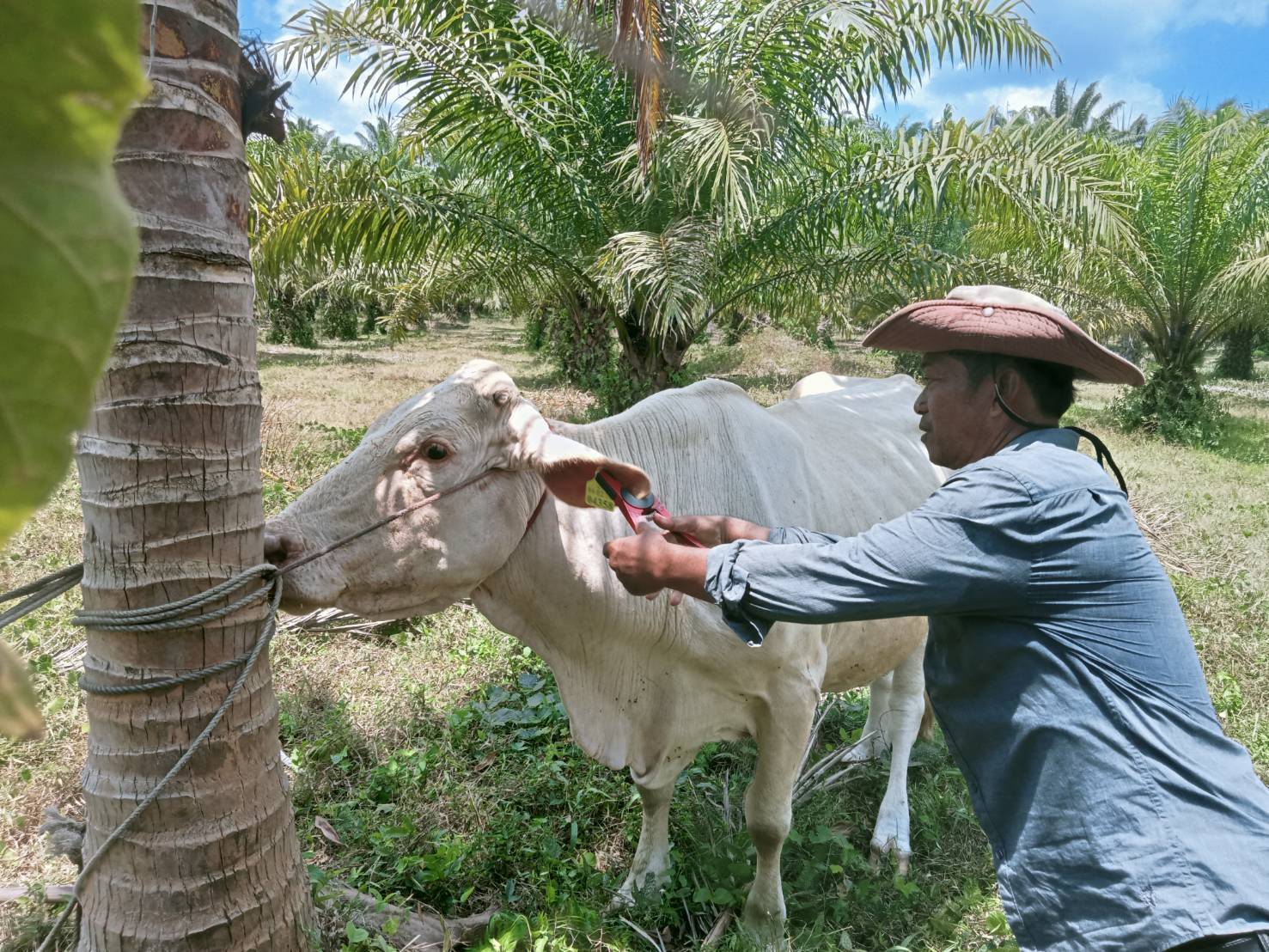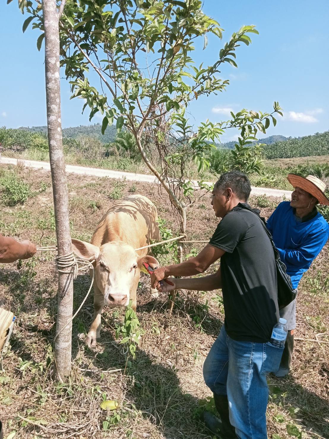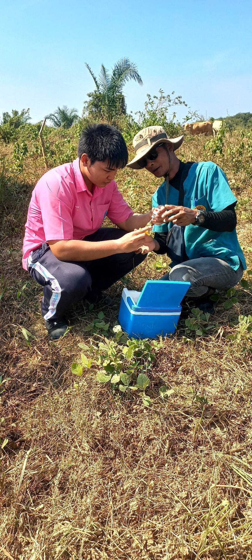 ลงพื้นที่ดำเนินการฉีดวัคซีนป้องกันโรคปากและเท้าเปื่อยในโค พร้อมทั้งดำเนินการติดและซ่อมแซมเครื่องหมายประจำตัวสัตว์ (เบอร์หู) ให้แก่โคของเกษตรกร จำนวน ๒๒ ตัว ของนางดวงใจ เอกวรรณัง ณ หมู่ที่ ๔ ตำบลหงษ์เจริญ อำเภอท่าแซะ จังหวัดชุมพร