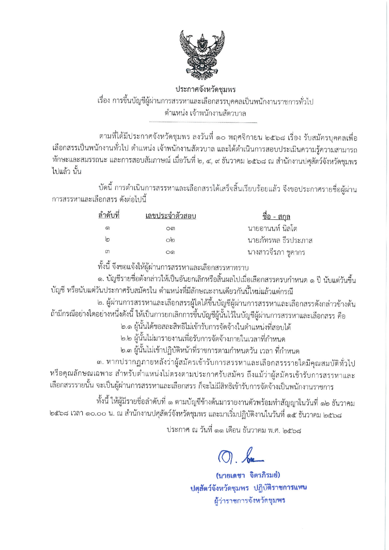 ประกาศจังหวัดชุมพร เรื่อง การขึ้นบัญชีผู้ผ่านการสรรหาและเลือกสรรบุคคลเป็นพนักงานราชการทั่วไป ตำแหน่ง เจ้าพนักงานสัตวบาล <<...รายละเอียด...>>