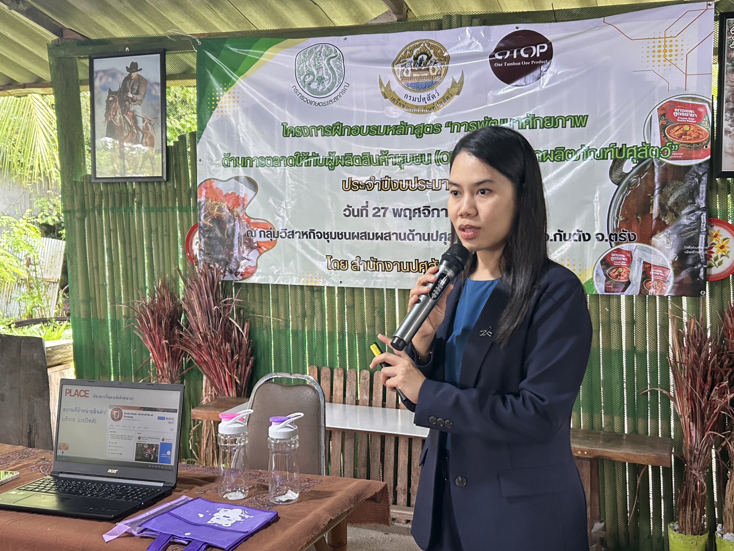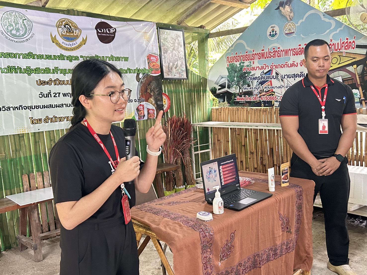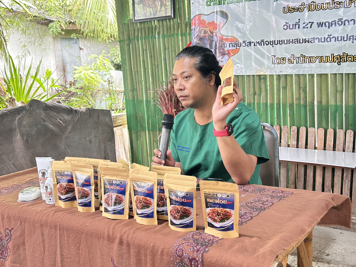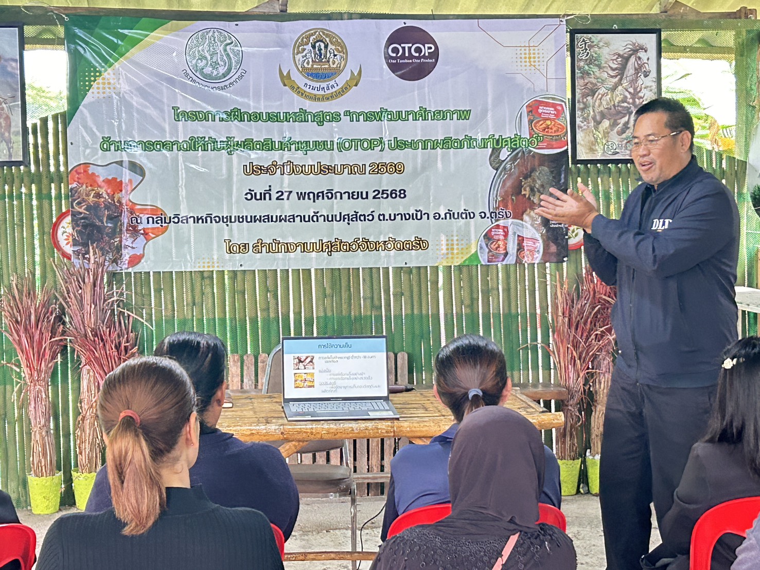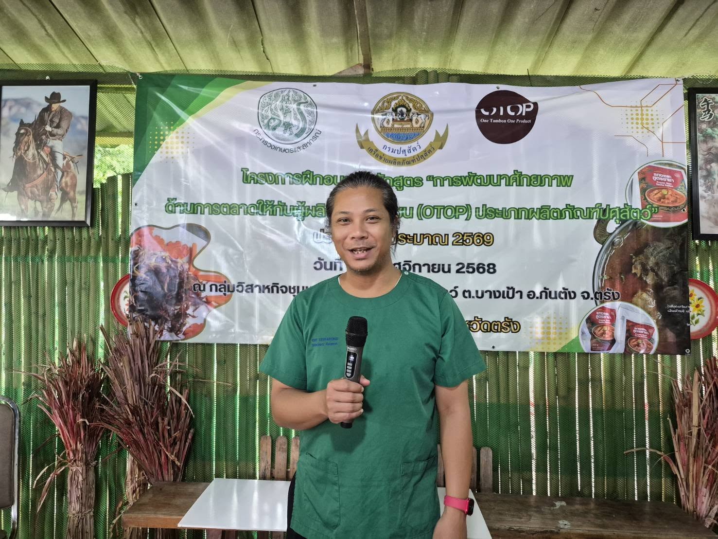 วันที่ 25 พฤศจิกายน 2568 นายสัตวแพทย์กฤษณ์ วีระวงศ์ ปศุสัตว์จังหวัดตรัง เป็นประธานกล่าวเปิดการฝึกอบรม โครงการพัฒนาผลิตภัณฑ์สินค้าชุมชน (OTOP) ประเภทผลิตภัณฑ์ปศุสัตว์ ประจำปีงบประมาณ 2569 ณ กลุ่มวิสาหกิจชุมชนผสมผสานด้านปศุสัตว์ เลขที่ 45 หมู่ที่ 7 ตำบลบางเป้า อำเภอกันตัง จังหวัดตรัง มีวิทยากรโดยมีรายละเอียดการฝึกอบรม บรรยาย หัวข้อ การแปรรูปผลิตภัณฑ์ปศุสัตว์ การใช้วัตถุเจือปนในผลิตภัณฑ์เนื้อสัตว์ การแปรรูปผลิตภัณฑ์แพะฝอย การคำนวณต้นทุนการแปรรูปผลิตภัณฑ์ โดยวิทยากรจาก ศูนย์วิจัยและพัฒนาผลิตภัณฑ์ปศุสัตว์ปทุมธานี กองผลิตภัณฑ์ปศุสัตว์ หัวข้อ การตลาด โดย นางสาวอินทิรา ไพรัตน์ และหัวข้อ การขนส่งผลิตภัณฑ์ โดย ไปรษณีย์จังหวัดตรัง