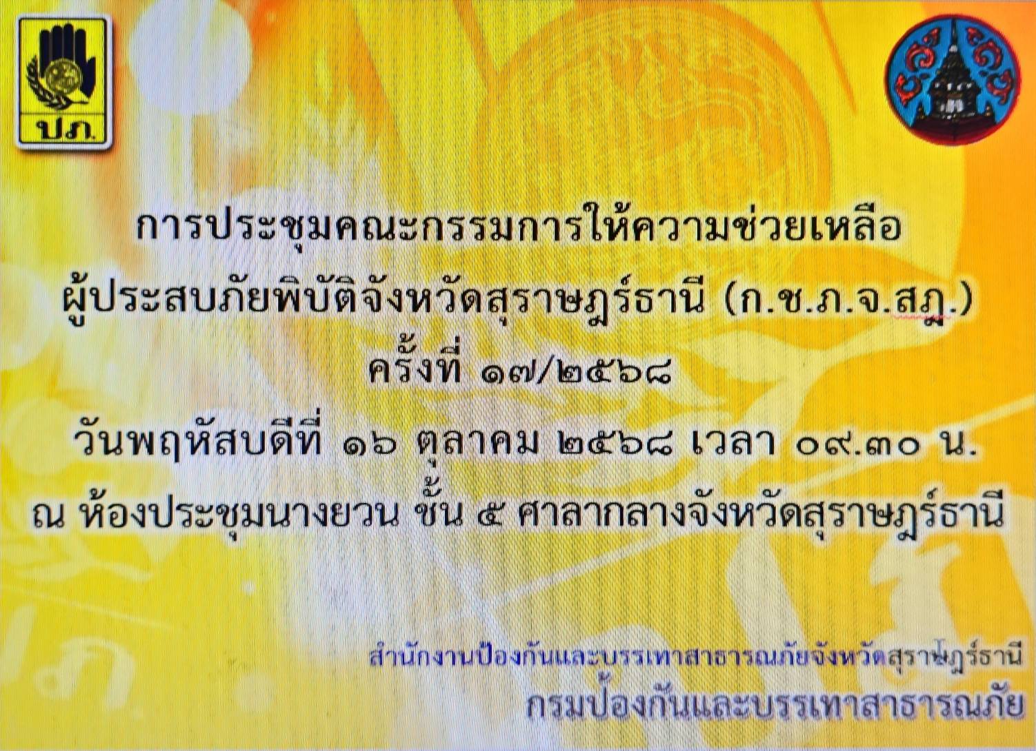 ปศุสัตว์จังหวัดสุราษฎร์ธานีเข้าร่วมประชุมคณะกรรมการให้ความช่วยเหลือผู้ประสบภัยพิบัติ จังหวัดสุราษฎร์ธานี (กชภจ.สฎ.)