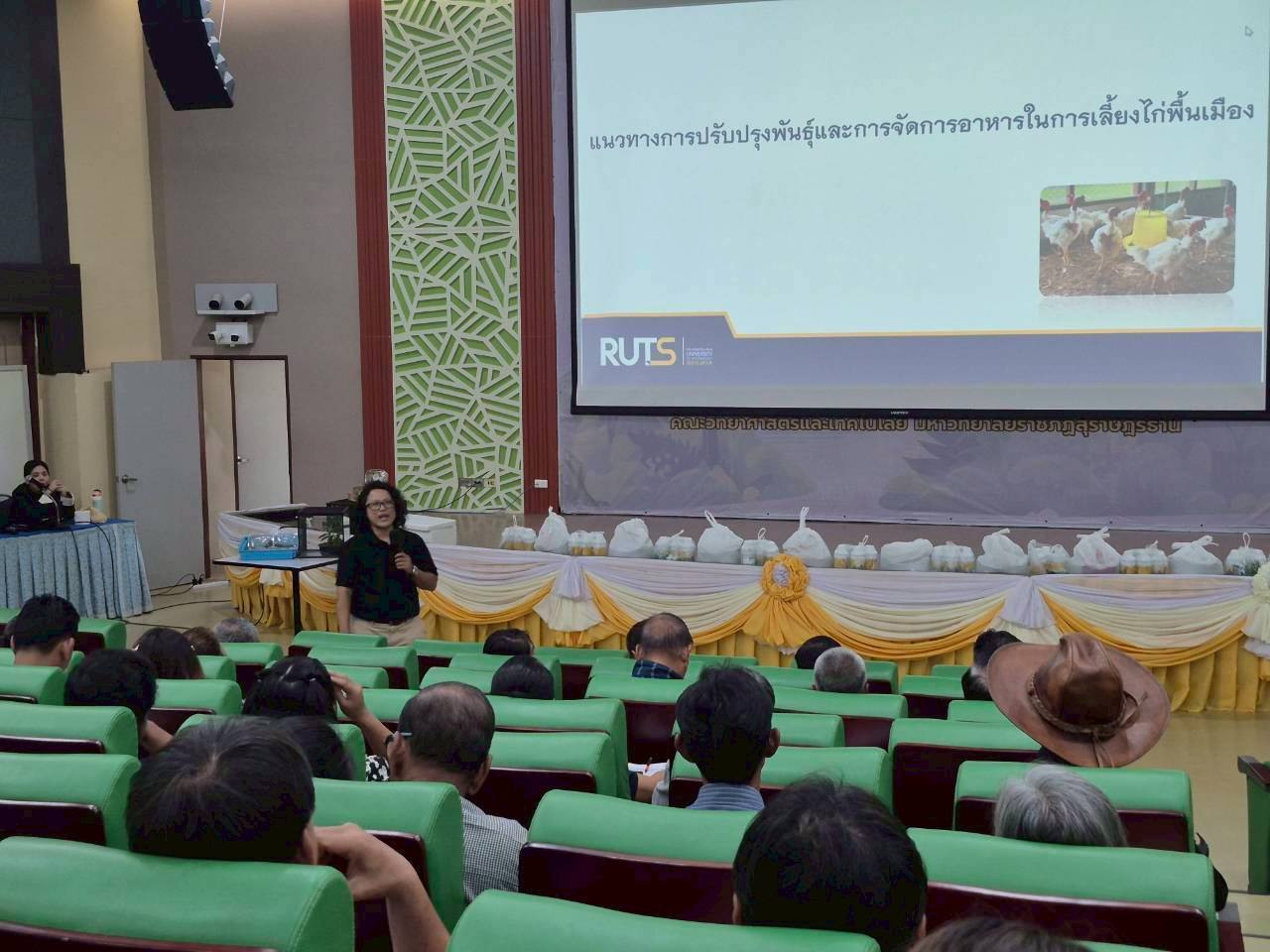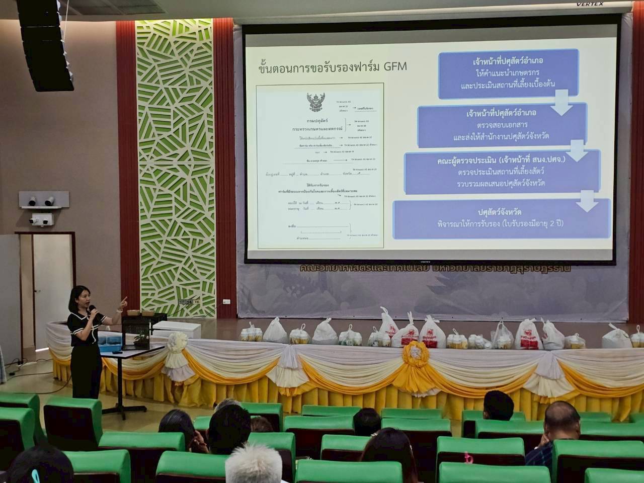 นายสมพล ไวปัญญา ปศุสัตว์จังหวัดสุราษฎร์ธานี มอบหมายให้ นางสาวกรองจิตร์ เทพธานี หัวหน้ากลุ่มยุทธศาสตร์และสารสนเทศการปศุสัตว์ เจ้าหน้าที่กลุ่มยุทธศาสตร์ฯ ปศุสัตว์อำเภอ และเจ้าหน้าที่สำนักงานปศุสัตว์จังหวัดสุราษฎร์ธานี จัดกิจกรรมอบรมเกษตรกรผู้เลี้ยงไก่พื้นเมืองในพื้นที่จังหวัดสุราษฎร์ธานี ภายใต้โครงการมหกรรมปศุสัตว์เมืองคนดีวิถีคนใต้ 2569 เพื่อส่งเสริมให้เกษตรกรมีความรู้ด้านการจัดการฟาร์ม และการเลี้ยงสัตว์ที่เหมาะสม (GFM) โรคที่สำคัญในสัตว์ปีก การเลี้ยงไก่พื้นเมืองเพื่อการค้า และไก่ขาวดอกแค/สูตรอาหารลดต้นทุน โดยมีเกษตรกรกลุ่มเป้าหมายเข้าร่วมอบรม 120 ราย จาก 17 อำเภอ ยกเว้น อำเภอเกาะสมุย และอำเภอเกาะพะงัน ณ ห้องประชุมวิทยพัฒน์ คณะวิทยาศาสตร์และเทคโนโลยี มหาวิทยาลัยราชภัฎสุราษฎร์ธานี