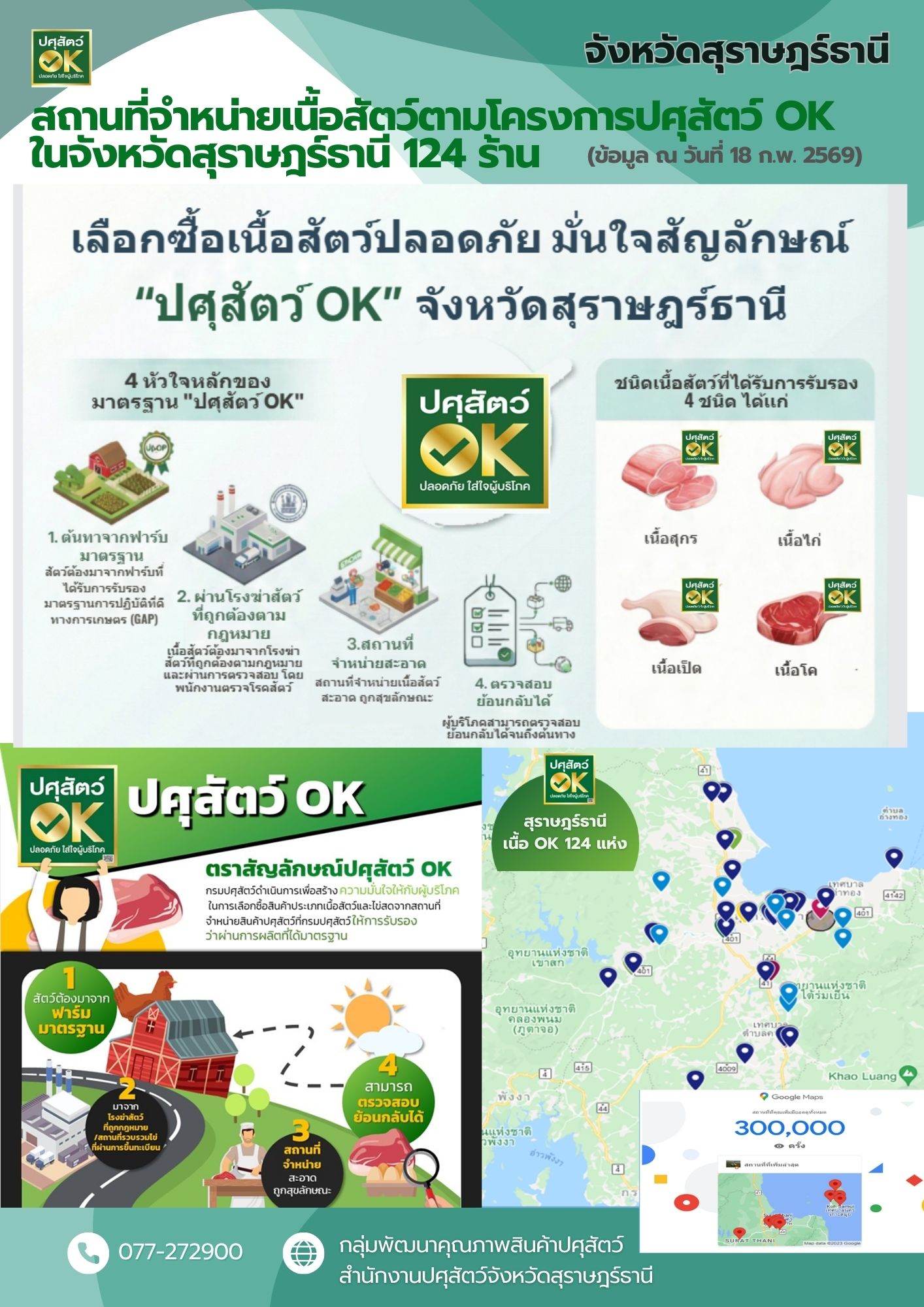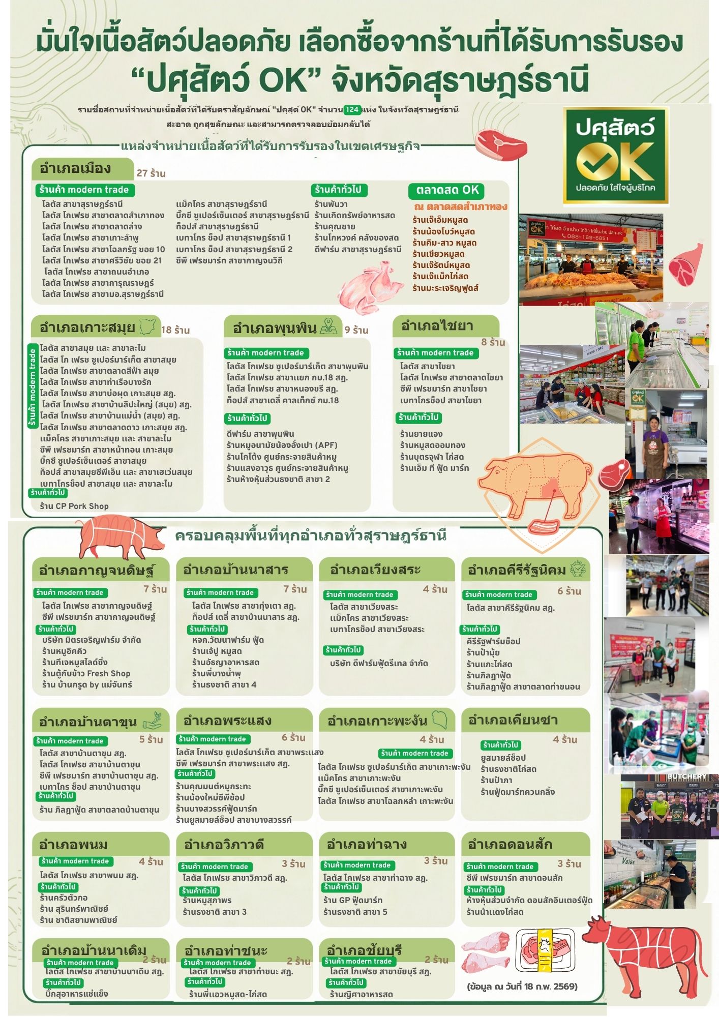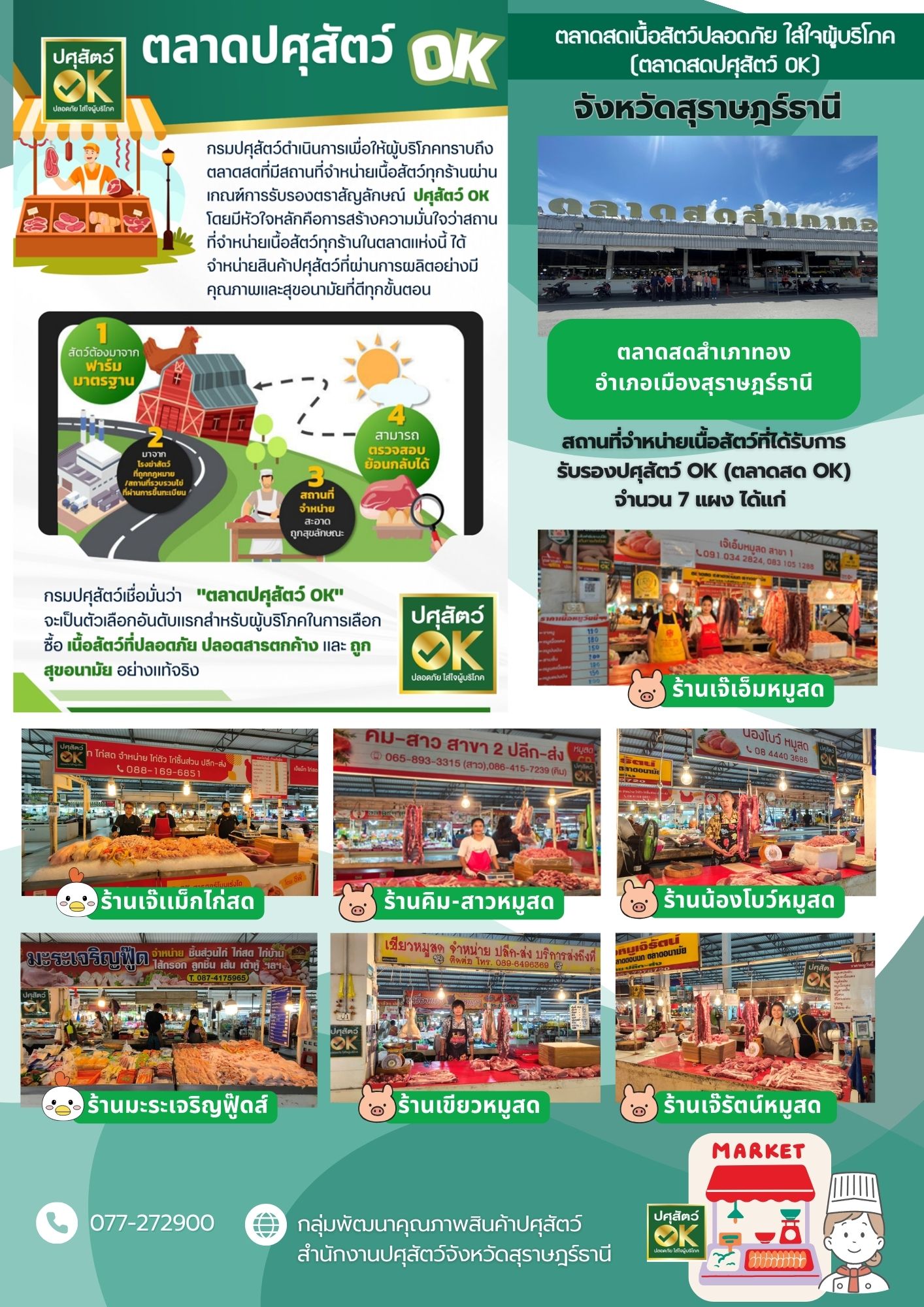 ขอประชาสัมพันธ์สถานที่จำหน่ายเนื้อสัตว์ที่ได้รับการรับรอง "ปศุสัตว์ OK" และ "ตลาดสด OK" ของจังหวัดสุราษฎร์ธานี